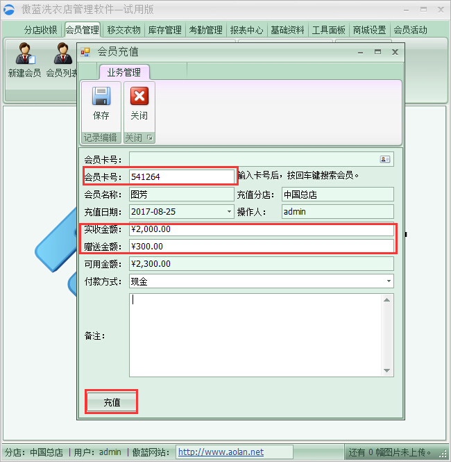 4、會員卡快速充值,點擊傲藍洗衣店管理軟件【會員管理】→【會員充值】提供快速充值的模塊,填入會員卡號(按Enter回車鍵即可快速搜索會員信息),填寫充值金額和贈送金額,點擊充值進行收款即可,如圖: