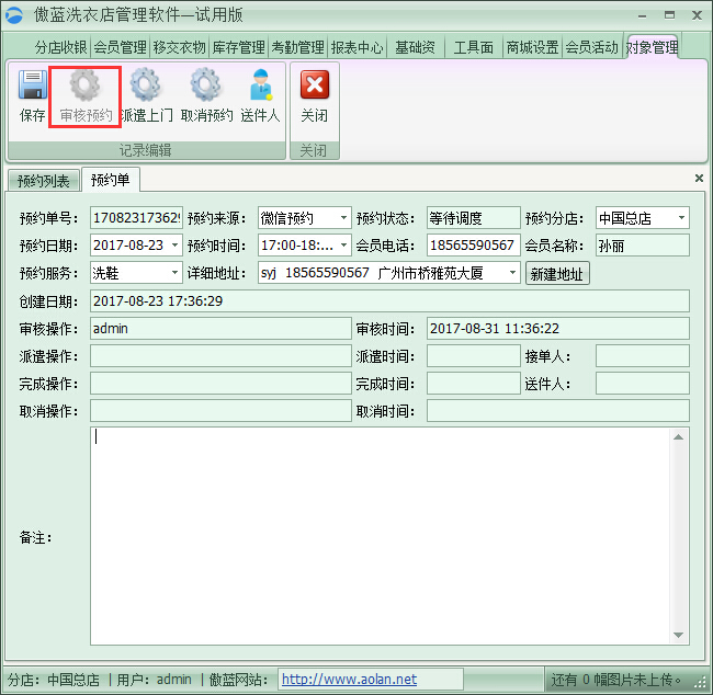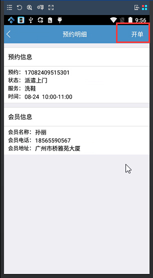 1、會員在線預約上門收衣之后,軟件會自動彈出預約提醒,門店工作人員點擊預約提醒,即可進去預約列表進行處理預約單,如圖: