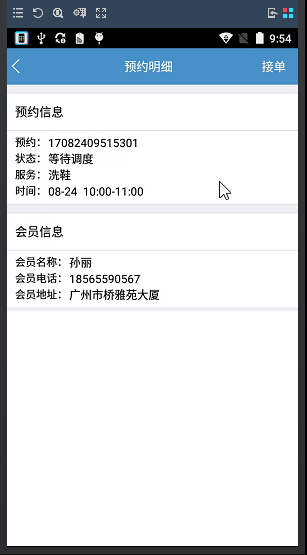 2、在門店軟件上已經審核過的預約單信息,員工手機上的上門收衣app即刻接收到預約通知,可在通知欄中點擊預約單列表,選中預約單可查看會員預約單上的電話地址,點擊接單,即可完成接單任務,如圖: