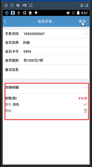①員工上門到客戶處收衣時,在會員的預約單明細中點擊開單給客戶開收衣單,填寫衣物明細記錄衣物原始狀態,包括衣物類型、顏色、瑕疵已經服務類型后保存,如圖: