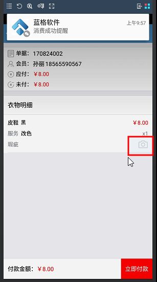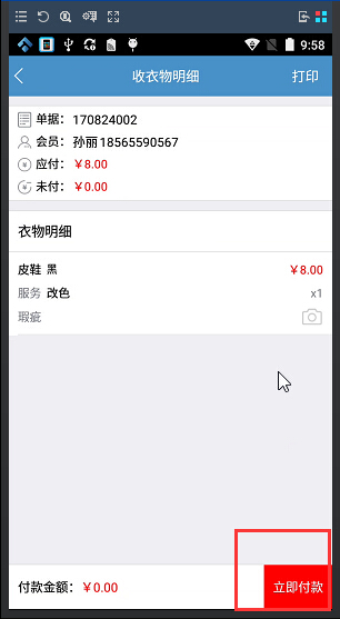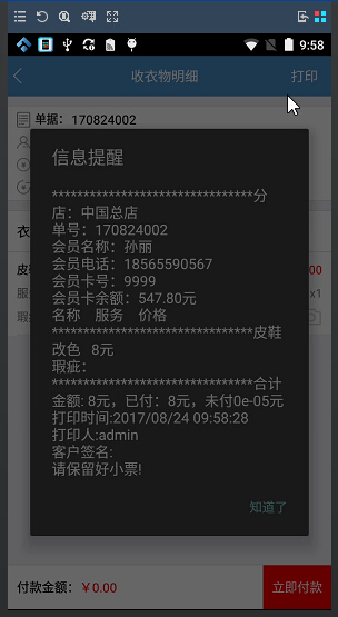 ③開單完成之后,員工還可以在上門收衣app上進行收款,收款完成之后還可以通過藍牙小票打印小票給會員,無需再重新回到門店再進行開單,提升員工的工作效率;并且員工可以隨時地接收到門店的預約通知,不會漏掉客戶任何一個預約單;同時門店軟件也可以實時接收到預約單的處理情況,衣物明細也是同步到門店軟件中的。如圖: