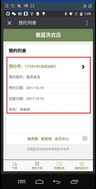 2、會員微信服務預約,點擊微型公眾號中的“我要預約”,選擇需要預約的服務類型;填寫好預約日期及時間點,以及預約地址,添加預約訂單,如圖: