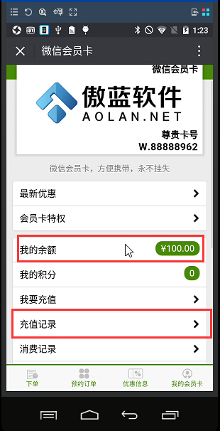 ①會員充值完成,可在【會員中心】→【會員卡】查看已經充值完成,并查看會員卡余額已經充值記錄。如圖:
