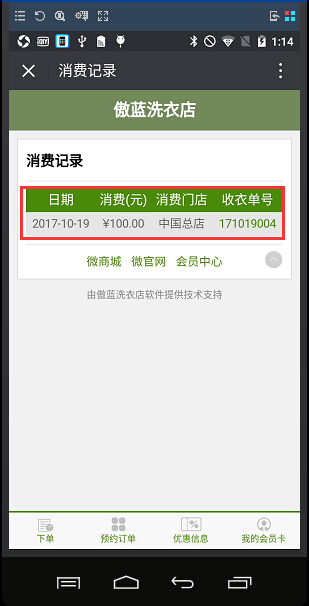 4、洗衣店會員公眾號會員消費記錄查詢,會員可通過微信公眾號了解自己的消費情況,點擊【會員中心】→【會員卡】→【消費記錄】可以清楚的看到消費日期、金額、消費門店和單號,會員清楚了解自己的消費記錄,透明化的消費記錄,促使會員對洗衣店的信任度提高,如圖: