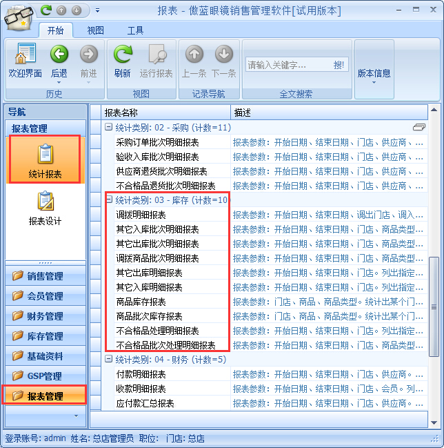 如:調撥明細報表、其他入庫批次明細報表、其他出庫批次明細報表、調撥商品批次明細報表、其他出庫明細報表、其他入庫明細報表、商品庫存報表、商品批次庫存報表、不合格品處理明細報表、不合格品批次處理明細報表,這豐富的統(tǒng)計、明細報表記錄了整個眼鏡門店內的庫存情況,協(xié)助眼鏡店更加精準、清晰的管理好商品庫存。