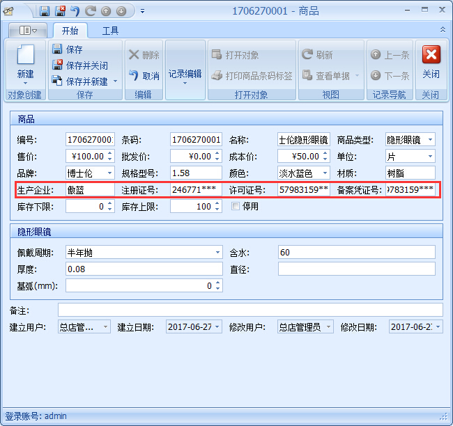 2、隱形眼鏡管理模塊,新建隱形眼鏡商品:點擊【GSP管理】→【商品】點擊新建,進入新建隱形眼鏡商品界面,填入隱形眼鏡的詳細信息。按照政策規定,隱形眼鏡商品必須登記“生產企業”“注冊證號”“許可證號”“備案憑證號”,填寫完畢,保存關閉即可,如圖: