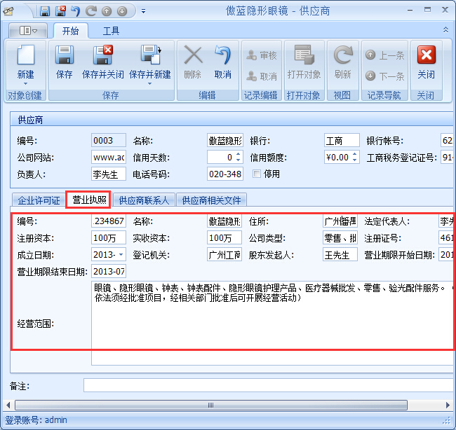 ②根據GSP要求,隱形眼鏡供應商只有電話、負責任等基礎的信息是不夠的,必須記錄企業許可證、營業執照等企業的詳細信息,方便了解到隱形眼鏡的詳細生產,企業許可證是隱形眼鏡供應商第三類醫療器械銷售許可證,以方便相關部門查閱檢查,因此必須一一記錄,如圖: