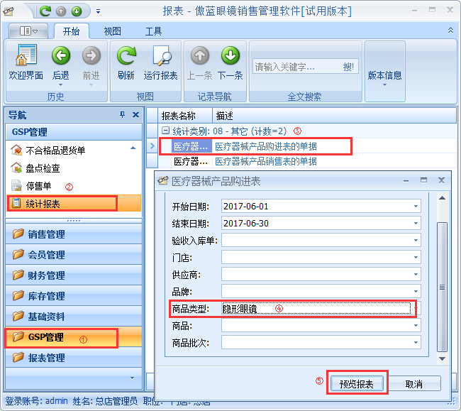 4、隱形眼鏡入庫(kù)報(bào)表打印提交。按食藥監(jiān)管理規(guī)定,眼鏡店必須定期打印隱形眼鏡的入庫(kù)報(bào)表進(jìn)行提交,傲藍(lán)眼鏡銷售管理軟件具體操作:點(diǎn)擊【GSP管理】→【統(tǒng)計(jì)報(bào)表】選擇“醫(yī)療器械產(chǎn)品購(gòu)進(jìn)表”選擇隱形眼鏡的商品類型,即可預(yù)覽隱形眼鏡采購(gòu)入庫(kù)的報(bào)表,如圖: