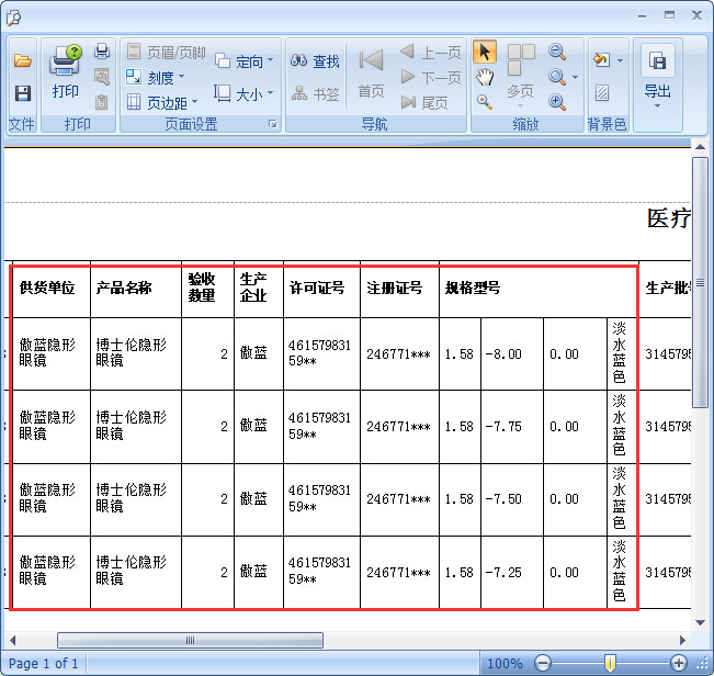 ①隱形眼鏡的采購(gòu)報(bào)表嚴(yán)格按照規(guī)定進(jìn)行打印,如圖: