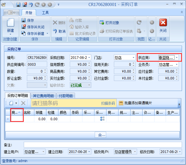 ②在采購(gòu)訂單管理界面點(diǎn)擊“新建”進(jìn)入,隱形眼鏡采購(gòu)單新建界面,選擇采購(gòu)的供應(yīng)商(若供應(yīng)商未經(jīng)過(guò)審核,軟件將不能保存單據(jù),所以在新建供應(yīng)商的時(shí)候,必須嚴(yán)格做好每一步),在商品添加的位置選擇需要采購(gòu)隱形眼鏡,如圖: