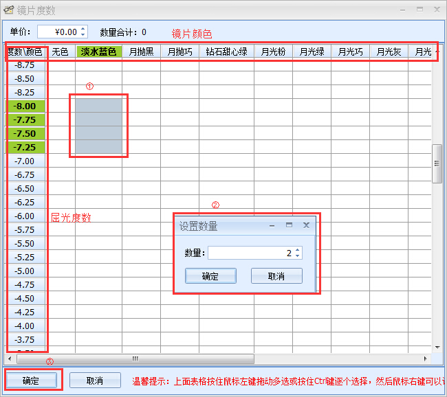 ③選擇隱形眼鏡商品之后,軟件會(huì)直接跳轉(zhuǎn)到隱形眼鏡的二維表(二維表豎向表示隱形眼鏡的屈光度數(shù),橫向表示鏡片的顏色),在鏡片度數(shù)二維表中,按住鼠標(biāo)左鍵進(jìn)行拖動(dòng)可以批量選擇鏡片的規(guī)格,單擊右鍵則可以設(shè)置本次采購(gòu)的各個(gè)規(guī)格的數(shù)量,輸入相應(yīng)的數(shù)量,點(diǎn)擊“確定即可”,如圖: