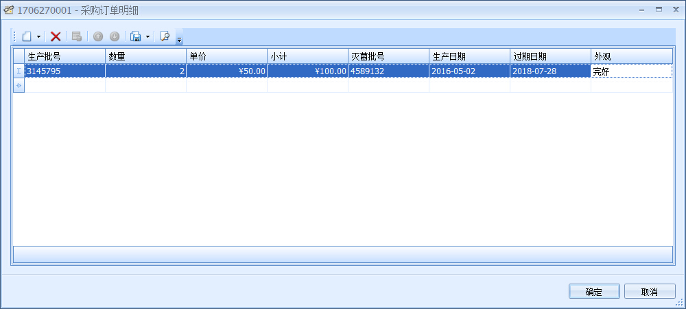④隱形眼鏡商品的規(guī)格數(shù)量確定之后,按照食品藥品監(jiān)督管理局(下稱食藥監(jiān))對(duì)于隱形眼鏡銷售的管理規(guī)定,眼鏡店必須登記每批隱形眼鏡采購(gòu)的詳細(xì)信息,如:生產(chǎn)批號(hào)、滅菌批號(hào)、生產(chǎn)日期、過(guò)期日期等等,點(diǎn)擊采購(gòu)訂單中,商品數(shù)量后的圖標(biāo),進(jìn)入填寫(xiě)隱形眼鏡具體的生產(chǎn)批號(hào)等,如圖: