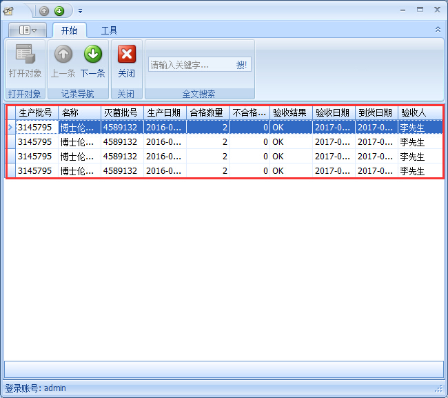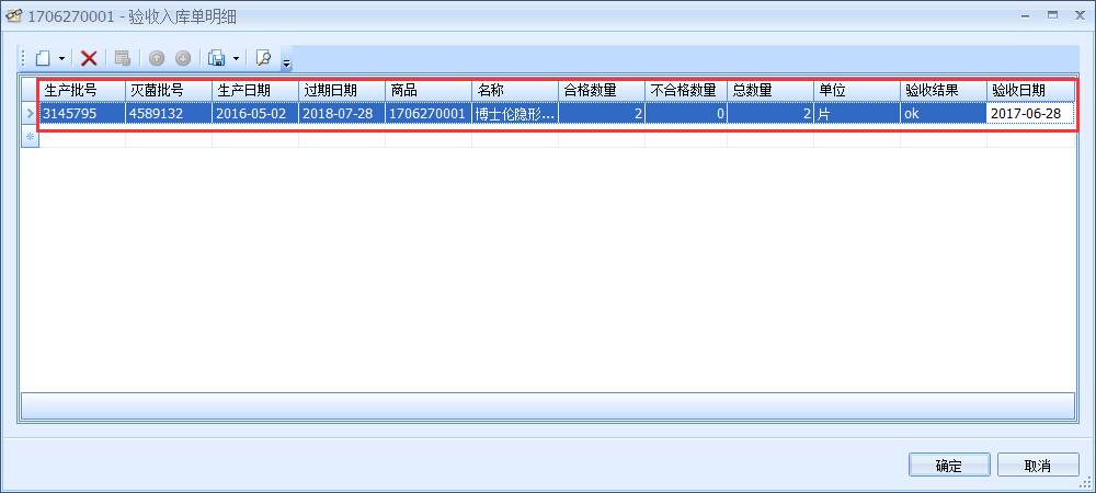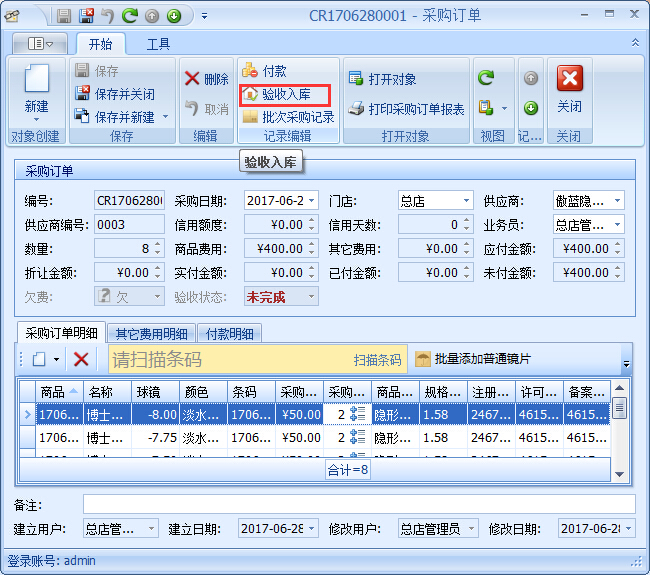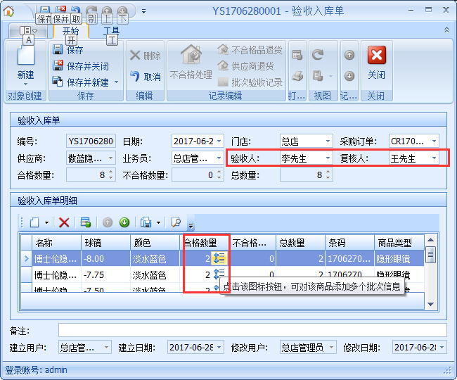 ②進(jìn)入驗(yàn)收入庫(kù)明細(xì)單中,詳細(xì)登記本次采購(gòu)隱形眼鏡的合格數(shù)量、不合格數(shù)量,已經(jīng)驗(yàn)收時(shí)間和結(jié)果,如圖: