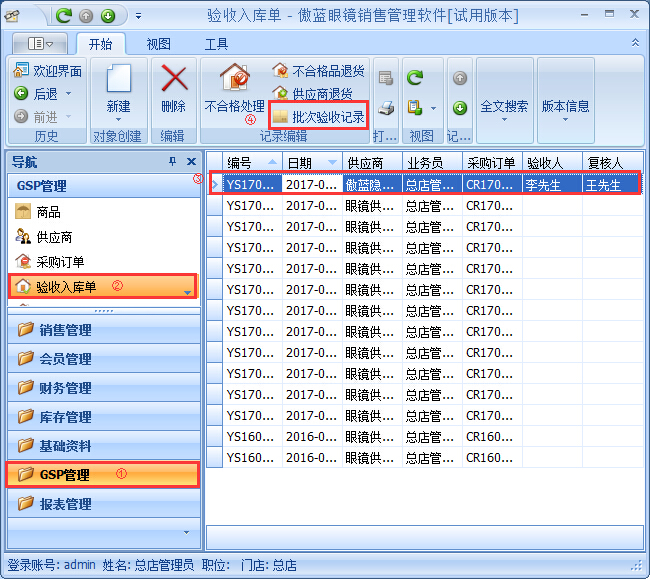 傲藍(lán)眼鏡銷售管理軟件GSP管理-隱形眼鏡采購(gòu)入庫(kù)驗(yàn)收管理操作已演示完畢。
