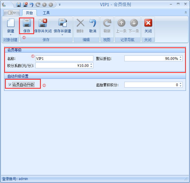 1、會員級別設置不同的優惠折扣,點擊【會員管理】→【會員級別】→“新建”建立會員等級,可在“會員等級”新建界面設置該改會員級別可默認享受的折扣優惠,以及積分系數,還可以設置會員級別在系統中自動升級,如圖: