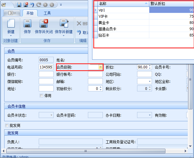 ①在新建會員時選擇相應的會員級別,就能讓改會員享受相應等級的會員折扣優惠,保存即可,如圖: