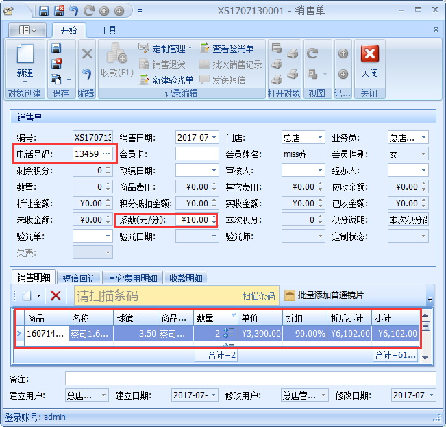 2、會員優惠折扣與積分已經在傲藍眼鏡店會員管理軟件中設定,那么在實際的銷售開單中是怎么實現的呢?具體操作步驟: