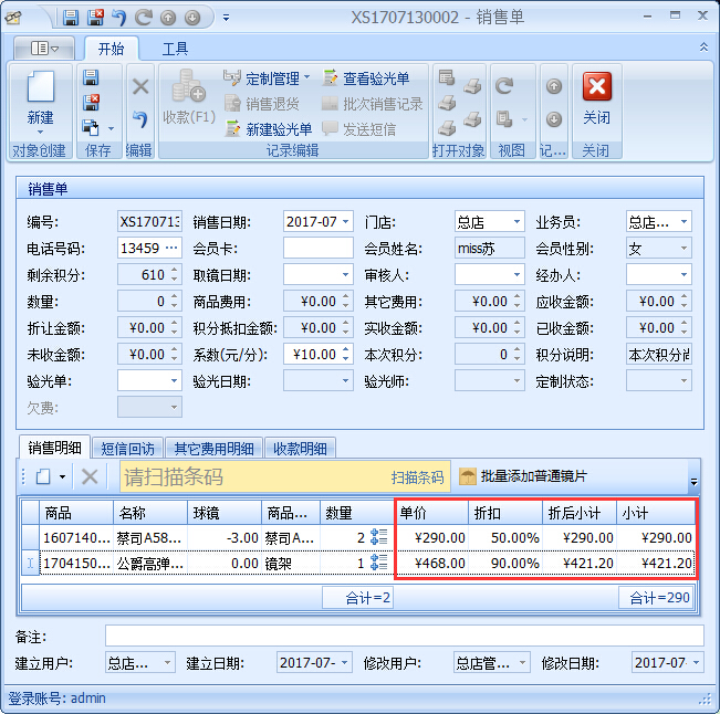 ②根據傲藍眼鏡店會員管理軟件中設定的優惠規則到期后系統就會自動打折,軟件還能智能對比優惠活動折扣與會員折扣,自動選擇低折扣給到會員,如圖: